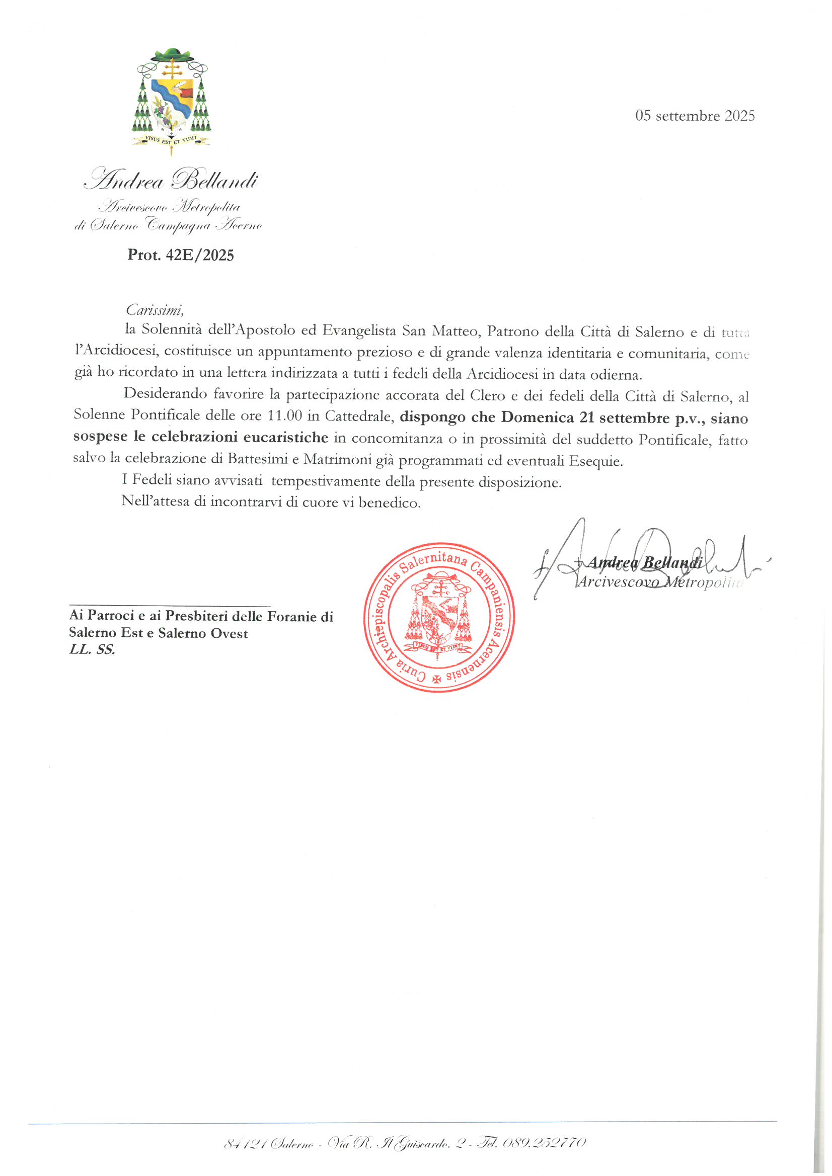 S.E. Mons. Andrea Bellandi dispone la sospensione delle Celebrazioni Eucaristiche in concomitanza o in prossimità del Solenne Pontificale delle ore 11.00 in Cattedrale, per favorire la partecipazione del Clero e dei fedeli della Città di Salerno.
