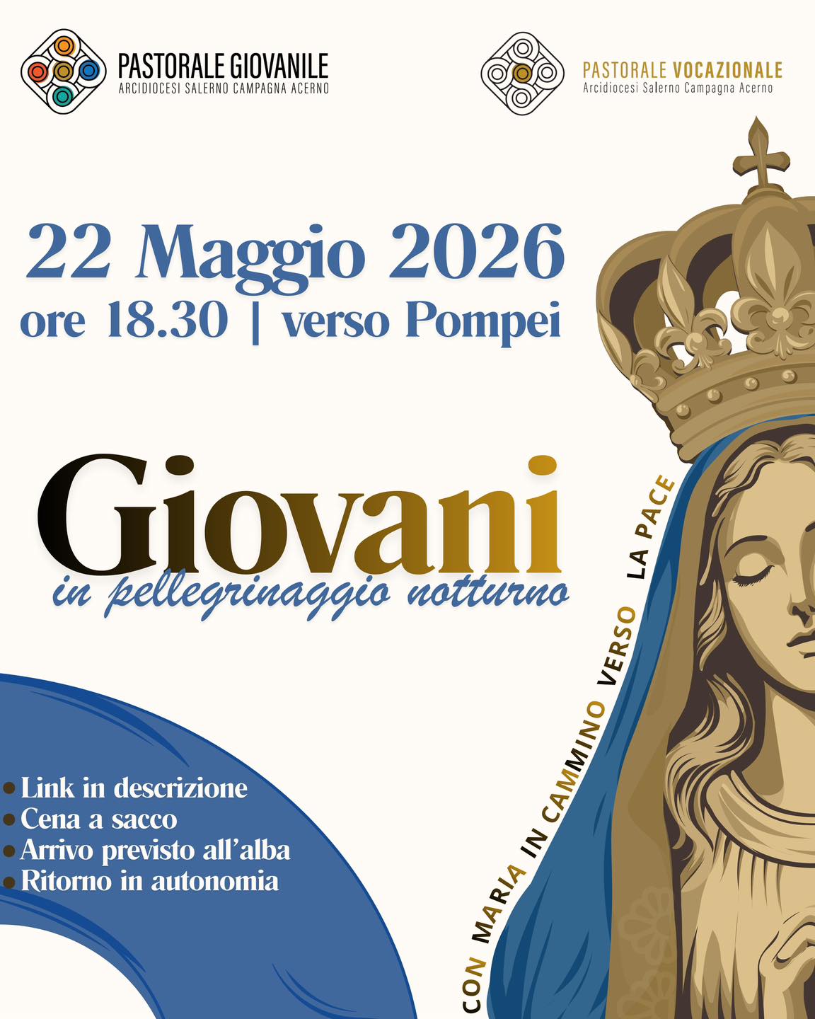 Venerdì 22 maggio si rinnova il tradizionale pellegrinaggio dei giovani a Pompei, organizzato dalla Pastorale Vocazionale e dalla Pastorale Giovanile della diocesi di Salerno. L’appuntamento per tutti i partecipanti è fissato alle ore 18.30 presso la chiesa di San Giorgio, da dove inizierà il cammino notturno.