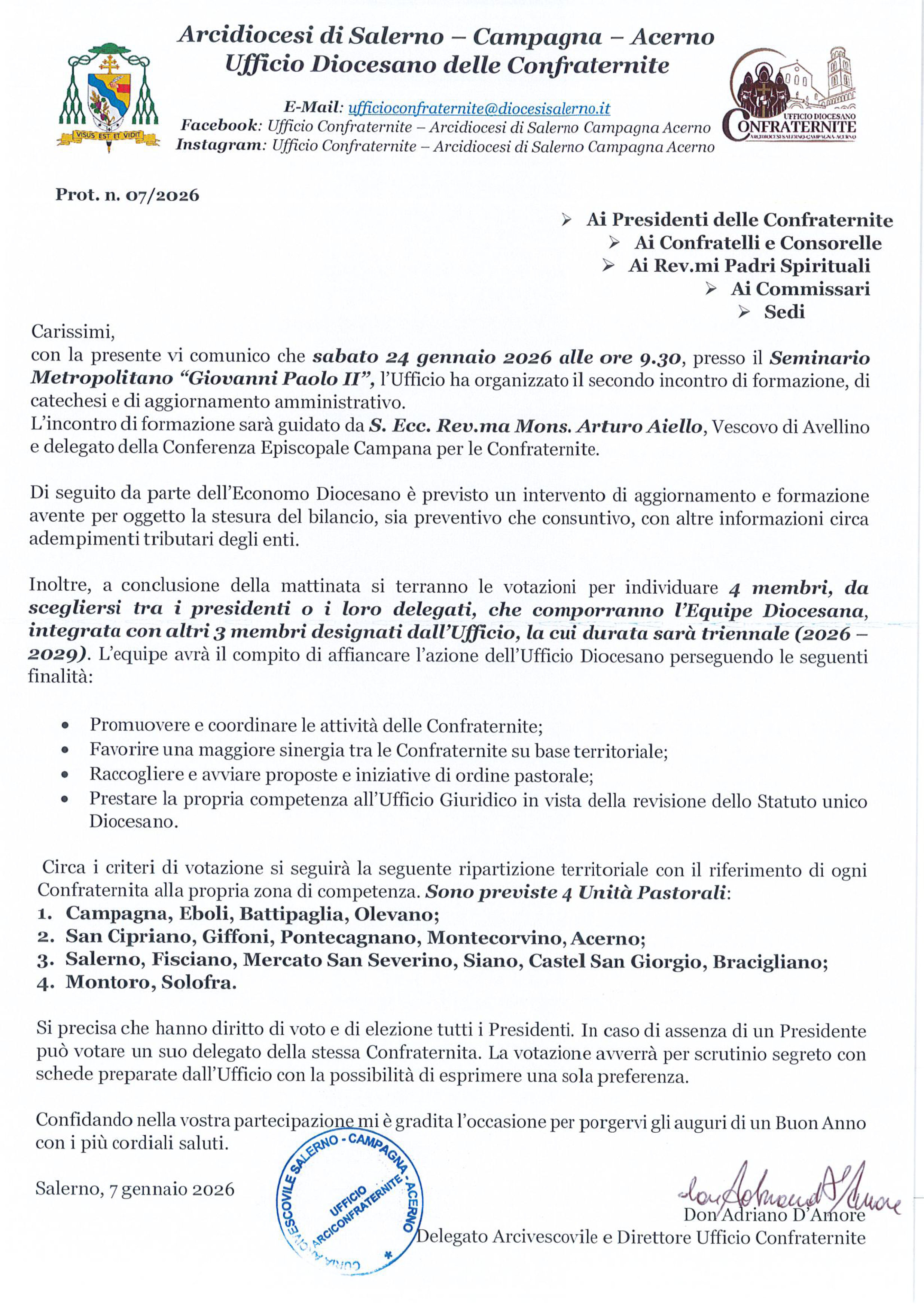 L’Ufficio Confraternite invita a partecipare al II incontro di formazione e di aggiornamento amministrativo che si terrà sabato 24 gennaio 2026 ore 9.30 presso il Seminario Metropolitano in Pontecagnano Faiano.
