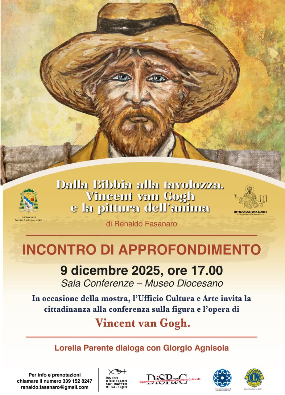 Martedì 9 dicembre alle ore 17.00, in occasione della mostra di Renaldo Fasanaro “Dalla Bibbia alla tavolozza. Van Gogh e la pittura dell’anima”, il Museo Diocesano “San Matteo” di Salerno ospiterà il professor Giorgio Agnisola, critico d’arte e saggista, che dialogherà con la professoressa Lorella Parente, teologa e direttrice dell’Ufficio per la Pastorale della Cultura e dell’Arte, sulla figura di Vincent van Gogh.