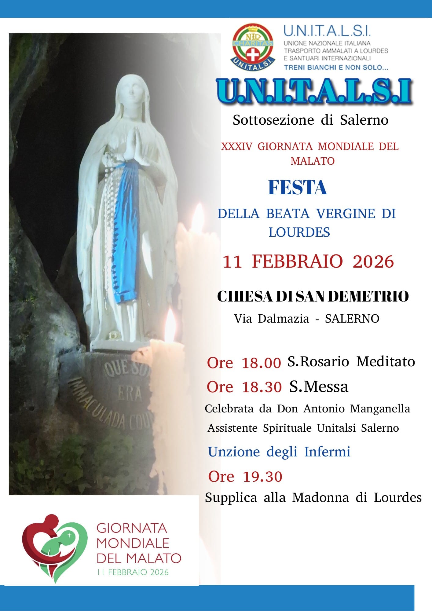 Mercoledì 11 febbraio presso la Chiesa di San Demetrio (Via Dalmazia, Salerno), in occasione della Festa della Beata Vergine di Lourdes, l’U.N.I.T.A.L.S.I. Sottosezione di Salerno invita l’intera comunità diocesana a partecipare alla XXXIV Giornata Mondiale del Malato.