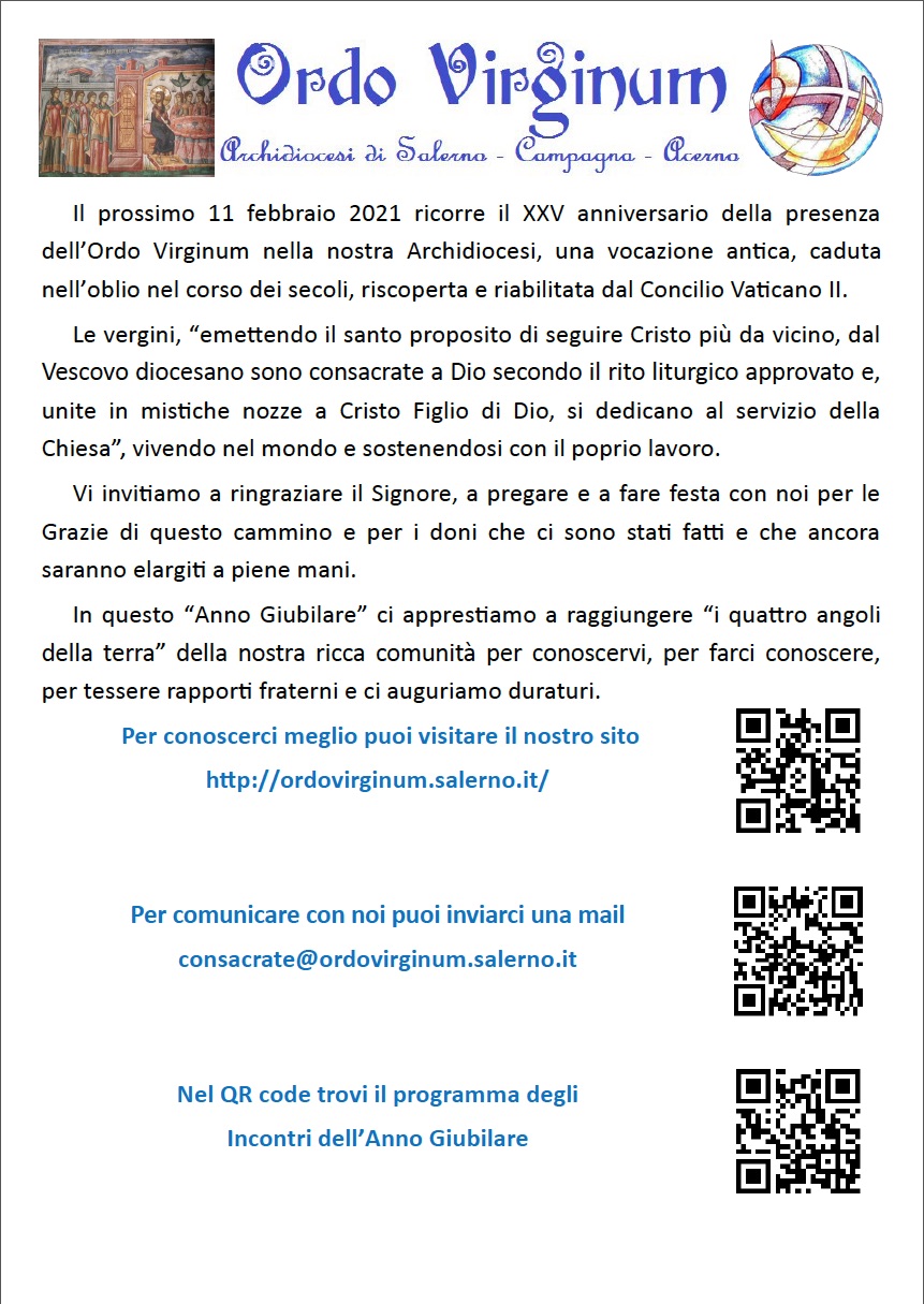 Quest’anno l’Ordo Virginum si appresta a vivere alcuni momenti di grande spiritualità e intensa fraternità per fare grata memoria del XXV anniversario di presenza nell’Archidiocesi.